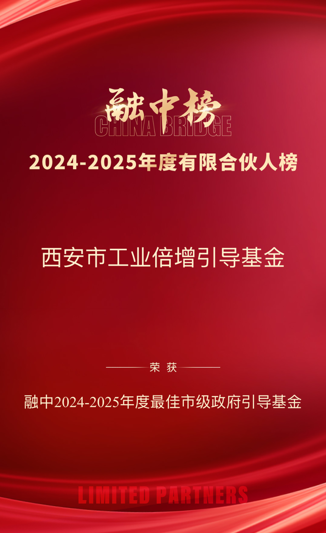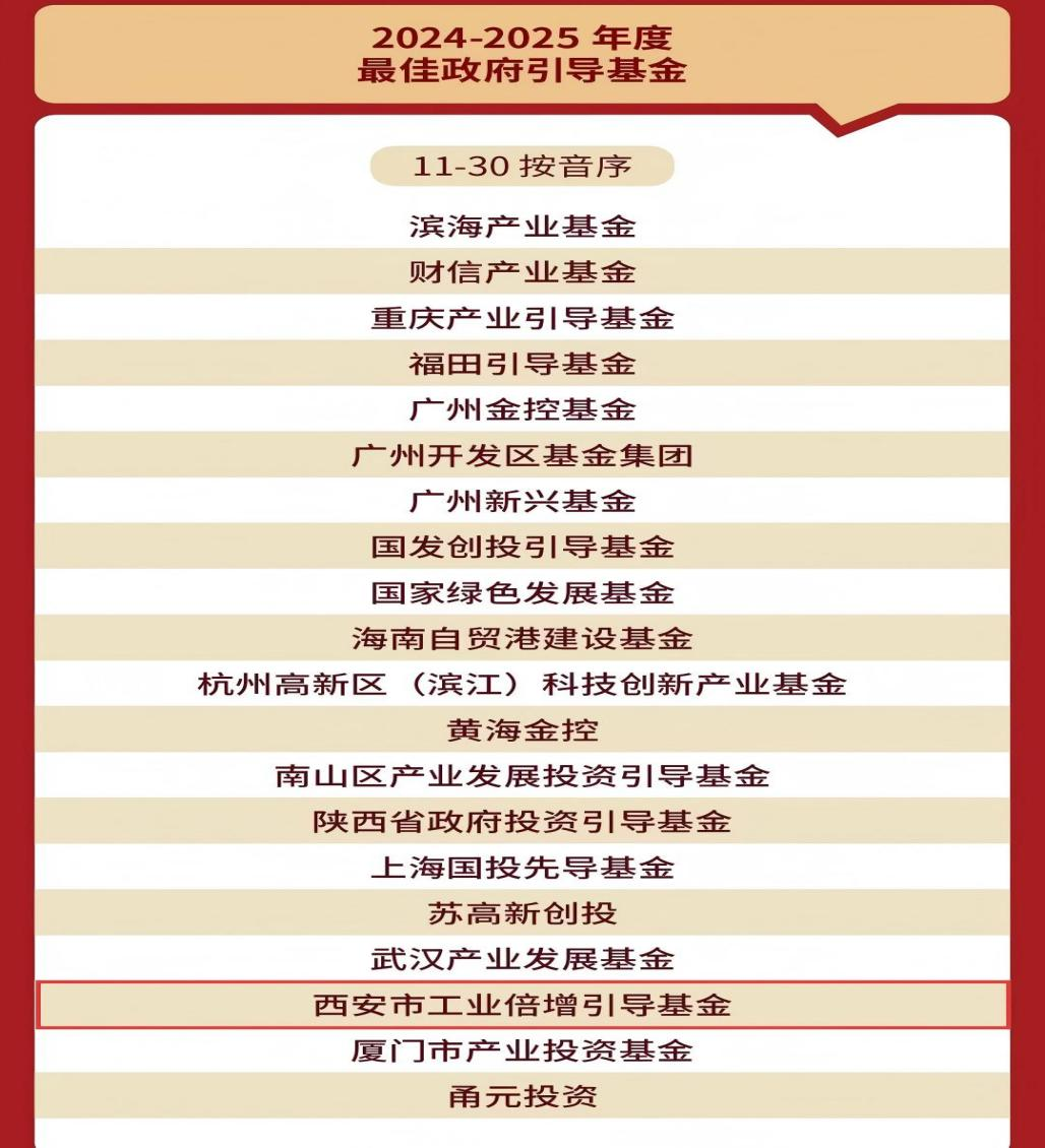 2025年7月23日,融中發(fā)布2024-2025年度有限合伙人榜單。由西安投資控股負(fù)責(zé)市場化運作的西安市工業(yè)倍增引導(dǎo)基金榮獲“2024-2025年度最佳政府引導(dǎo)基金”“2024-2025年度最佳市級政府引導(dǎo)基金”。這是繼獲得清科“2025年中國政府引導(dǎo)基金50”“2025年中國地市級政府引導(dǎo)基金30強”榜單后,西安市工業(yè)倍增引導(dǎo)基金今年斬獲的又一行業(yè)權(quán)威榮譽。